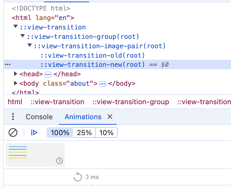 • There’s no such thing as clip-path in a ::view-transition pseudo class; if you’re animating an element that was clipped through overflow or clip path by another element it will appear unclipped in the pseudo class. You can probably fix this by making the parent element the clipped element, but in some cases you want to change the aspect ratio of an element when animating between states, I recommend doing this either when the new state is done as a separate animation or before the old state starts animating.